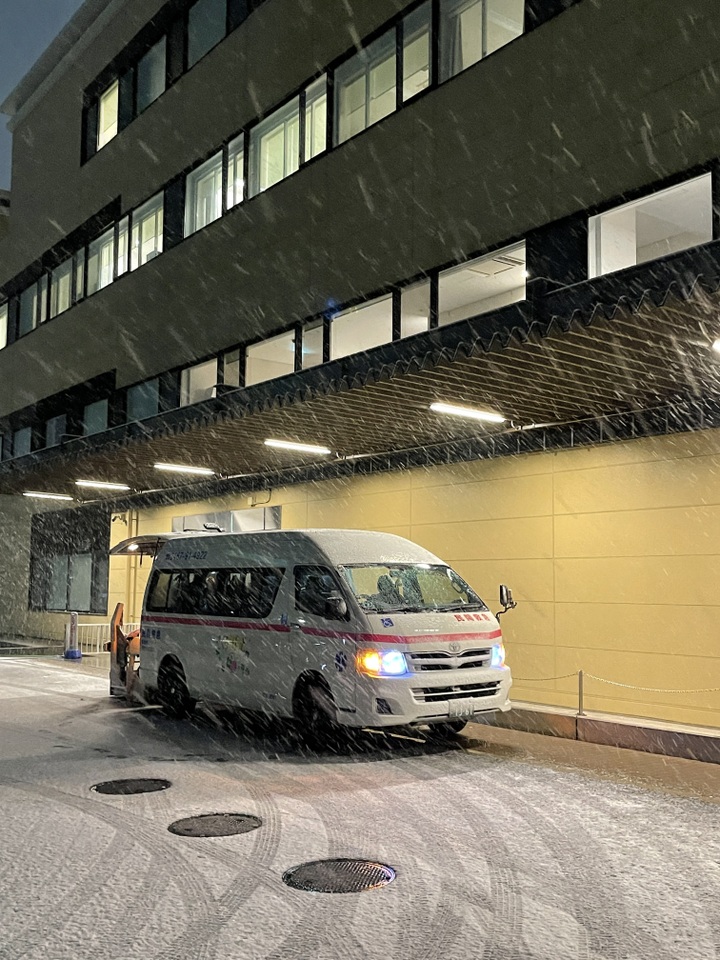 雪の中、鎌倉市の病院より千葉県松戸市の松戸市立総合医療センターまで、ストレッチャー搬送をさせて頂きました。